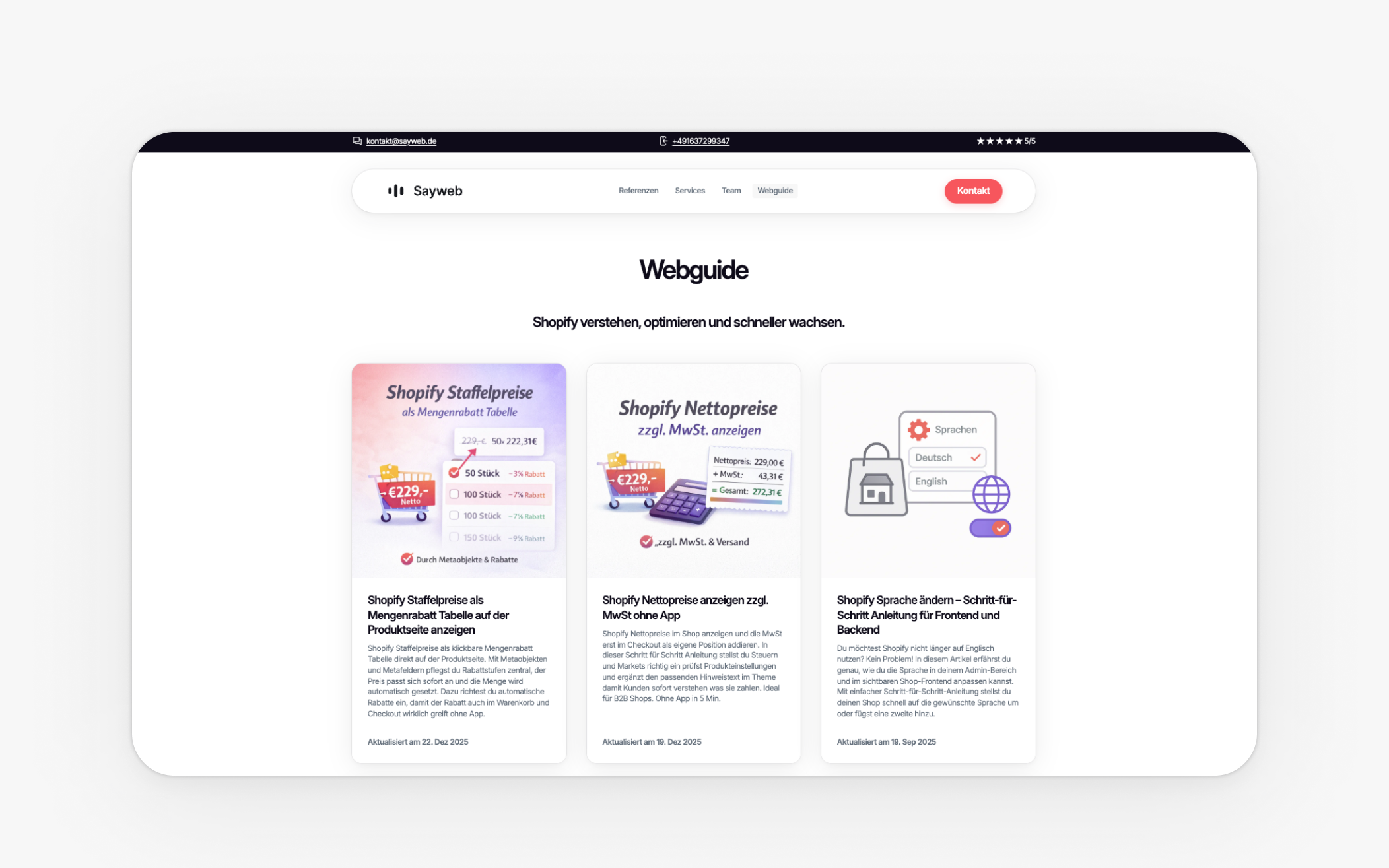 Wir bei sayweb glauben an Transparenz und Kompetenz statt an Agentur-Floskeln. Mit Fokus auf Shopify entwickeln wir individuelle Lösungen, die dein Business wirklich weiterbringen. Ehrlich, direkt und immer mit vollem Einsatz. Lass uns gemeinsam wachsen.